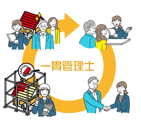 規模の大小問わず、ご相談から現地調査、工事契約、施工管理、そしてアフターサービスに至るまでを一貫して担当する「一貫管理士制度」を採用しています。お客様の気持ちを一番に理解している担当者が、はじめのご相談からお引き渡しまでマルっと担当することで確かな品質をご提供いたします。