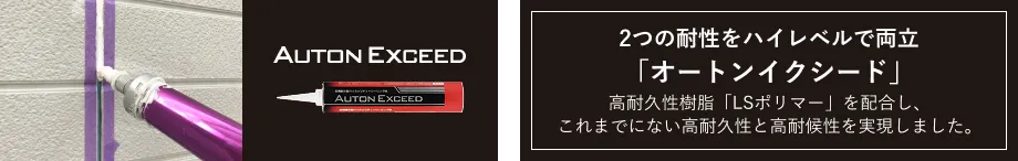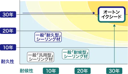シーリング材は、サイディングボードなど外壁材の隙間(目地)や、窓・ドアなど開口部周りの隙間などに充填する「防水材」の一種です。外壁と共に雨や外気の浸入を防ぎ、建物を守る重要な役割を担っています。外壁塗装同様、定期的なメンテナンスが必要となり、耐久性・耐候性の高い商材が求められます。「高千穂のリフォーム」では、耐久性、耐候性共に期待寿命30年の「オートンイクシード」(オート化学工業株式会社)をご提案いたします。