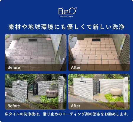 木材、コンクリート、タイルなどの多様な素材に対応し、木部の日焼けやカビ、油汚れといった特定の汚れにも対応可能。安全かつ効率的に施工が可能で、素材と地球環境の双方にサステナブルをもたらす優しい洗浄剤です。