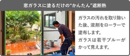 窓からの熱の出入りを抑えることで、家の断熱性は向上します。外壁を遮熱機能のある「クール&エコ」や、遮断熱機能の「スーパーエコ」で塗装するのであれば、窓の断熱性も高めることをお勧めします。窓ガラスに塗るだけで“かんたん”に遮断熱できる「節電ガラスコート」は、大掛かりな工事を必要としない省エネ節電対策、温暖化対策商品です。